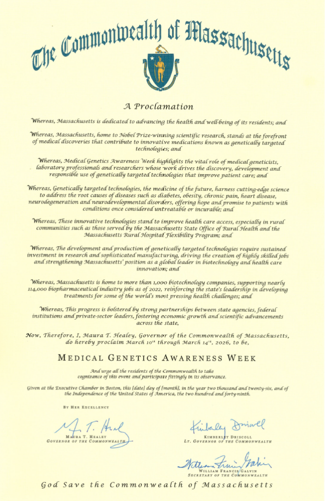 Governor Maura Healey has recognized genetically targeted technologies as a vital part of the future of medicine during 2026 Medical Genetics Awareness Week. Download the full proclamation as a PDF at the button below. The Commonwealth of Massachusetts A Proclamation Whereas,Over 200,000 children and adults in Massachusetts have intellectual and developmental disabilities; and Whereas,All people […]